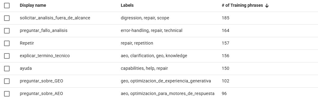 A medida que analice las interacciones reales, seguiré identificando nuevas intenciones y patrones de lenguaje para expandir y refinar esta base. Este proceso iterativo garantiza que el agente no solo sea sólido en su lanzamiento, sino que evolucione constantemente para ser cada vez más inteligente y preciso en su capacidad para ayudar a los usuarios.